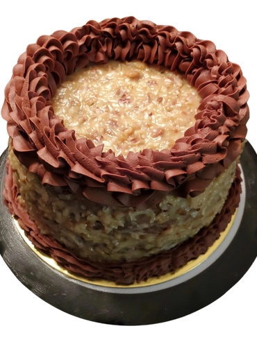 Old Fashion German Chocolate Cake with pecans and Delicious Chocolate Trim Frosting.